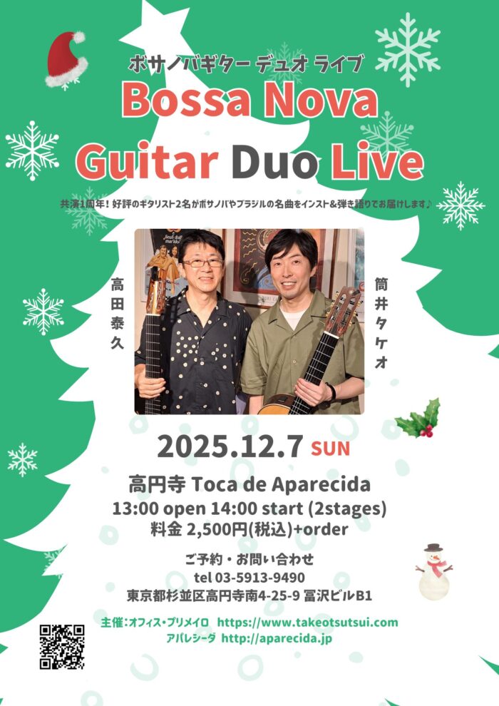 大変好評だったサンバ&ショーロ等ブラジル音楽ギタリストの高田さんとduo第2弾、インストを中心に歌モノもやろうかと考えています、お楽しみに!