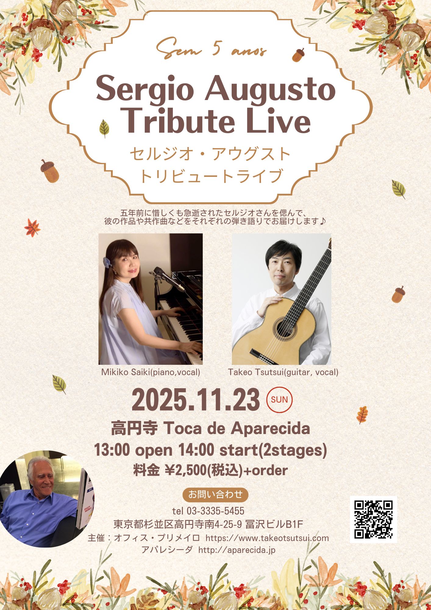 亡くなられて4年になるサンパウロのボサノバ・レジェンド、セルジオ・アウグストさんの作品や共作曲を演奏します。セルジオさんのラストアルバム「ロマンス」にも参加された才木さんと2マンで、最後はduo演奏もやります♪
